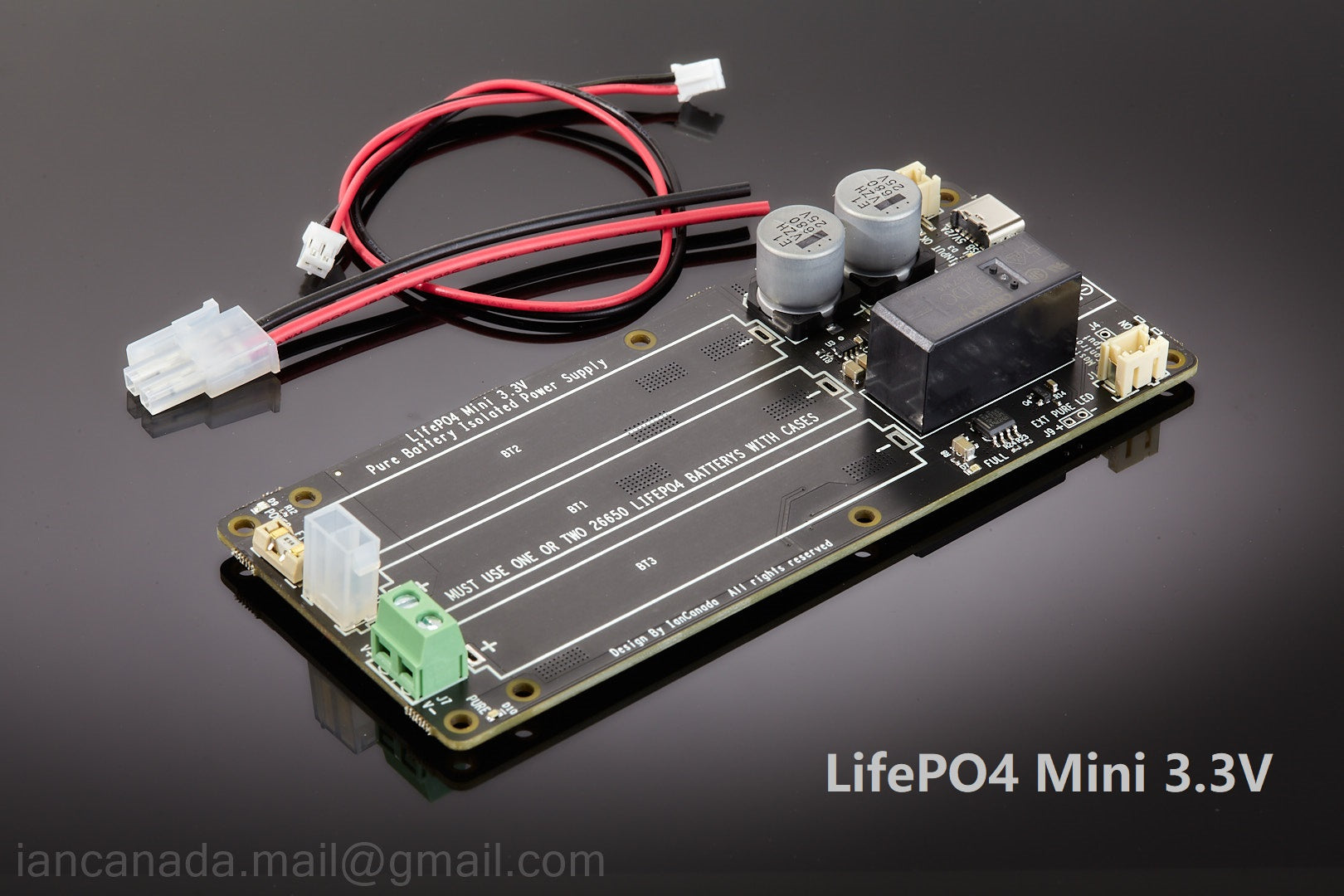 LifePO4 Mini 3.3V or 6.6V is a low cost high performance pure battery power supply. It makes use of the 26650 LifePO4 battery cells to achieve a great power supply performance. Because it is a pure passive power supply, there will be no feedback and no active components involved when it’s t urned on. At the pure output mode, only the fully charged battery cells will be applied to the load. It’s also capable of delivering up to 240 A